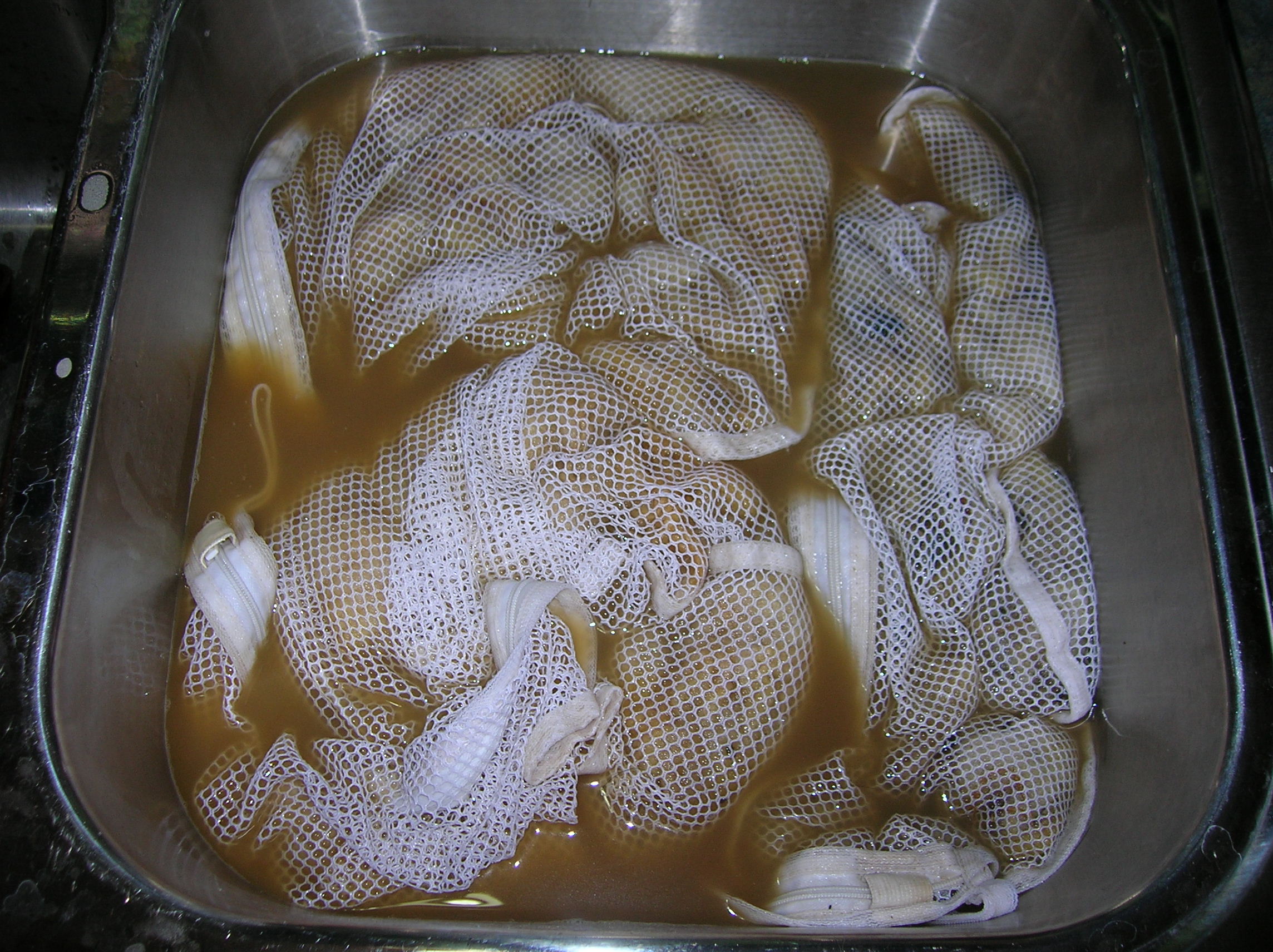 El tipo de agua y el jabón utilizado son importantes, así como la temperatura del agua. Este verano quise experimentar con el agua de mar, vivo muy cerca de la playa y leyendo por Internet descubrí que muchos países utilizaban el agua de mar para limpiar la lana ya que esta, en contacto con el mar hacia que la lanolina se convirtiera en jabón. Bueno, yo no vi salir espuma, pero fue muy agradable limpiarla en el mar, entre rocas y quedo realmente blanca.